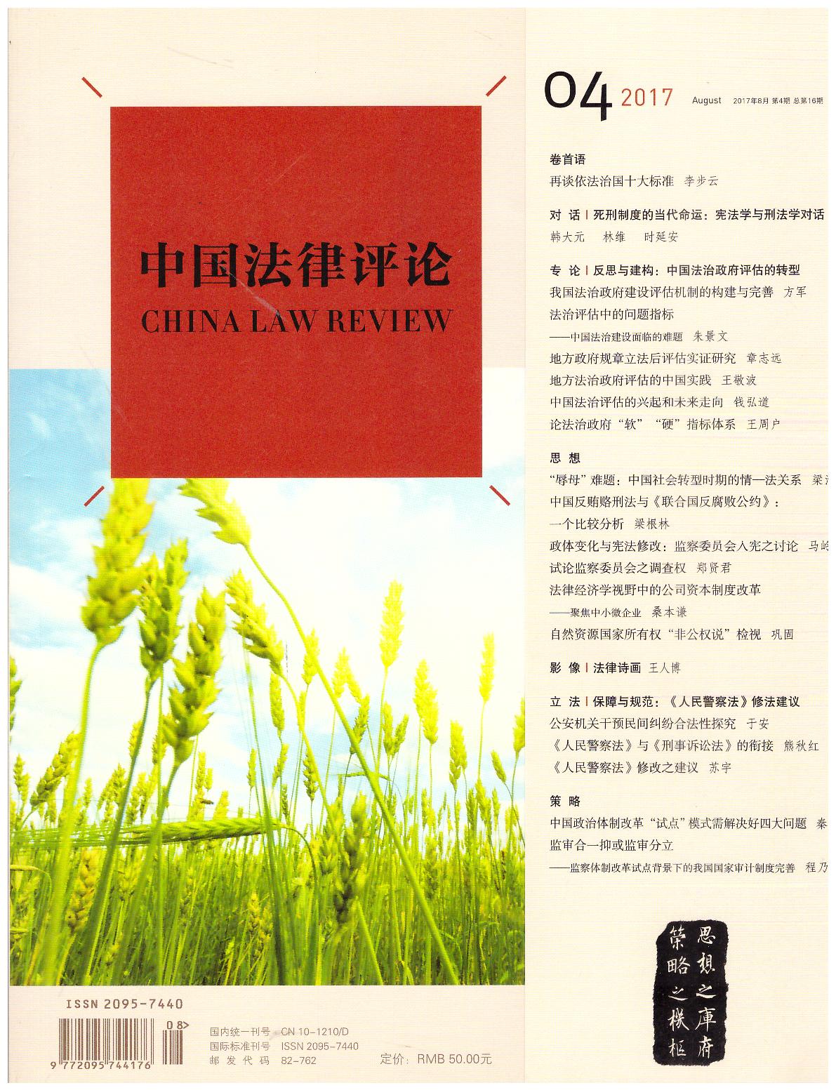 摘自:《中國法律評論(2017年8月第4期.總第16期)》,法律出版社2017年8月出版。內容簡介:本期四大重點話題:· 死刑制度的當代命運:憲法學與刑法學對話 · 建構與反思:中國法治政府評估的轉型 · 監(jiān)察制度改革:監(jiān)察委入憲討論、調查權行使及“試點”模式問題 · 保障與規(guī)范:《人民警察法》修法建議 。