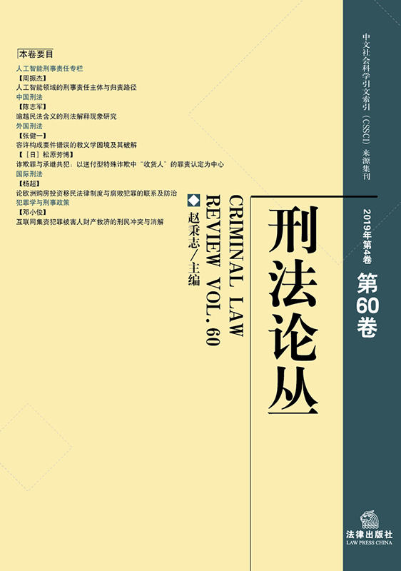 "《刑法論叢》第60卷共載文20篇,秉承本論叢業(yè)已形成的固定風(fēng)格,所收錄的論文在相當(dāng)程度上反映了近期我國(guó)刑法學(xué)界所取得的最新研究成果。內(nèi)容涵蓋中國(guó)刑法、外國(guó)刑法、國(guó)際刑法、犯罪學(xué)與刑事政策等諸多學(xué)科領(lǐng)域。